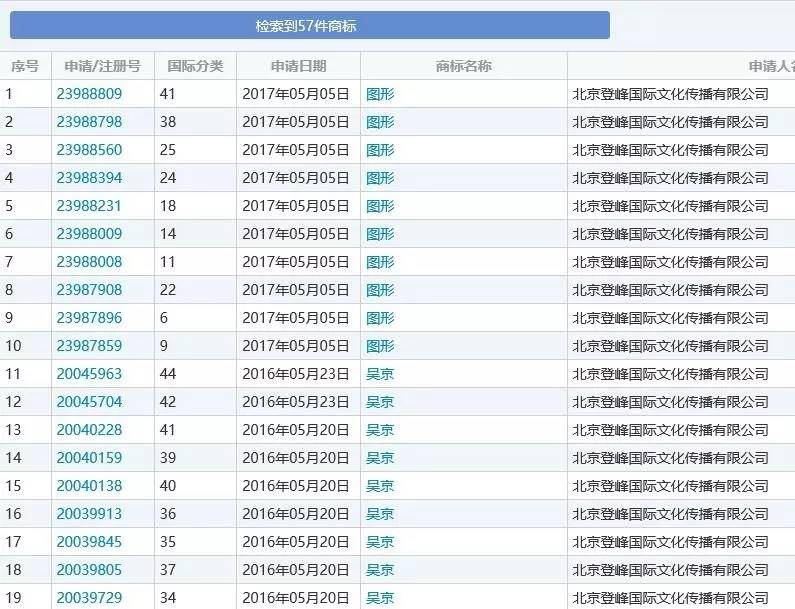 中国商标局显示,吴京作为实际控制人的北京登峰国际文化传播有限公司总计拥有57件商标,包括战狼的标志图形和中文,以及吴京的签名商标等。