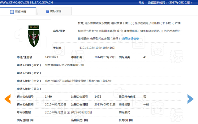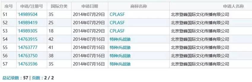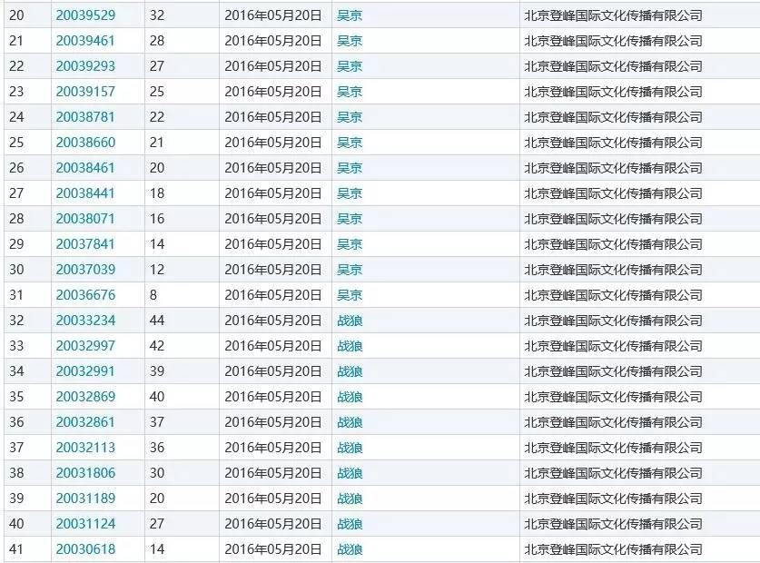 据了解,吴京作为大股东的北京登峰国际文化传播有限公司从2014年就开始注册“战狼”的相关商标和版权。